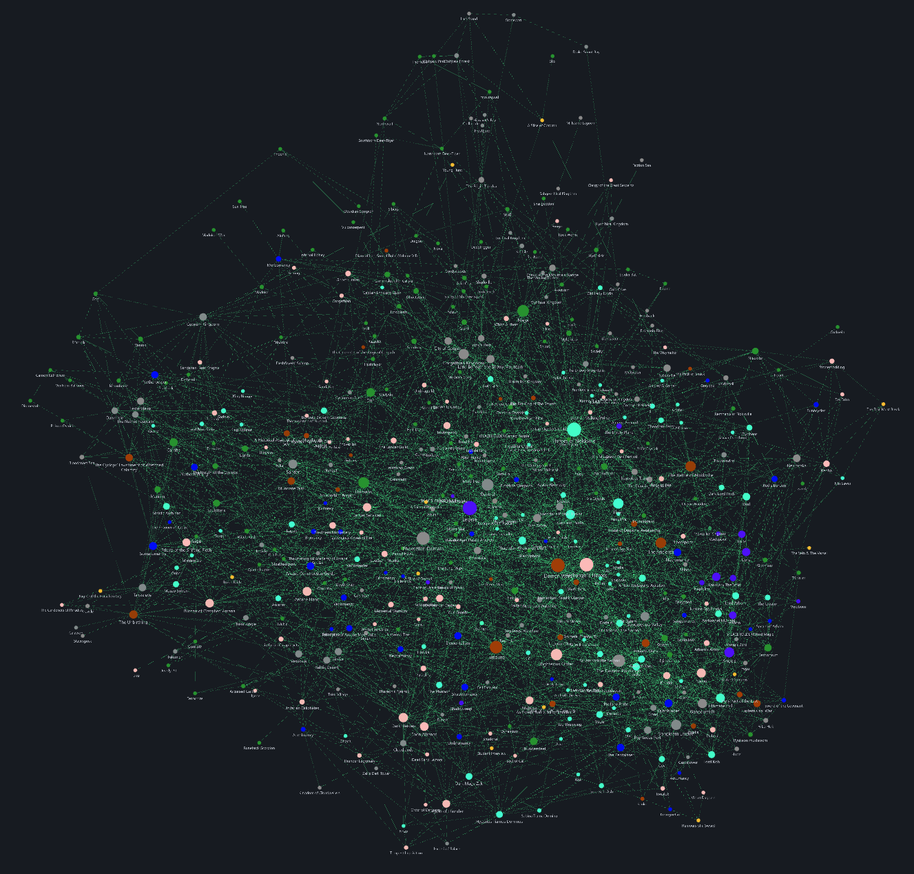The mind map of every article of the Legere worldbuilding project as of September 17, 2025. Each dot is an article (size of dot is relative to word count of the article), and each line indicates that the article is linked to another.