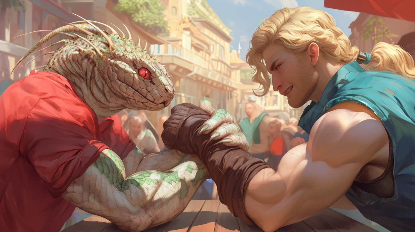 Red grabbed the bandit, then pushed him into the campfire face-first. The bandit retaliated with a stab to Red’s side, but all that procured from the naga was a snarl. Red headbutted him before asking if the bandit would like another dip in the fire. The bandit, bleeding and discombobulated agreed to Red’s offer of mercy—the naga says if the bandit chooses to run, he’d tell the others that he got away. The bandit hobbled away into the dark of the night.