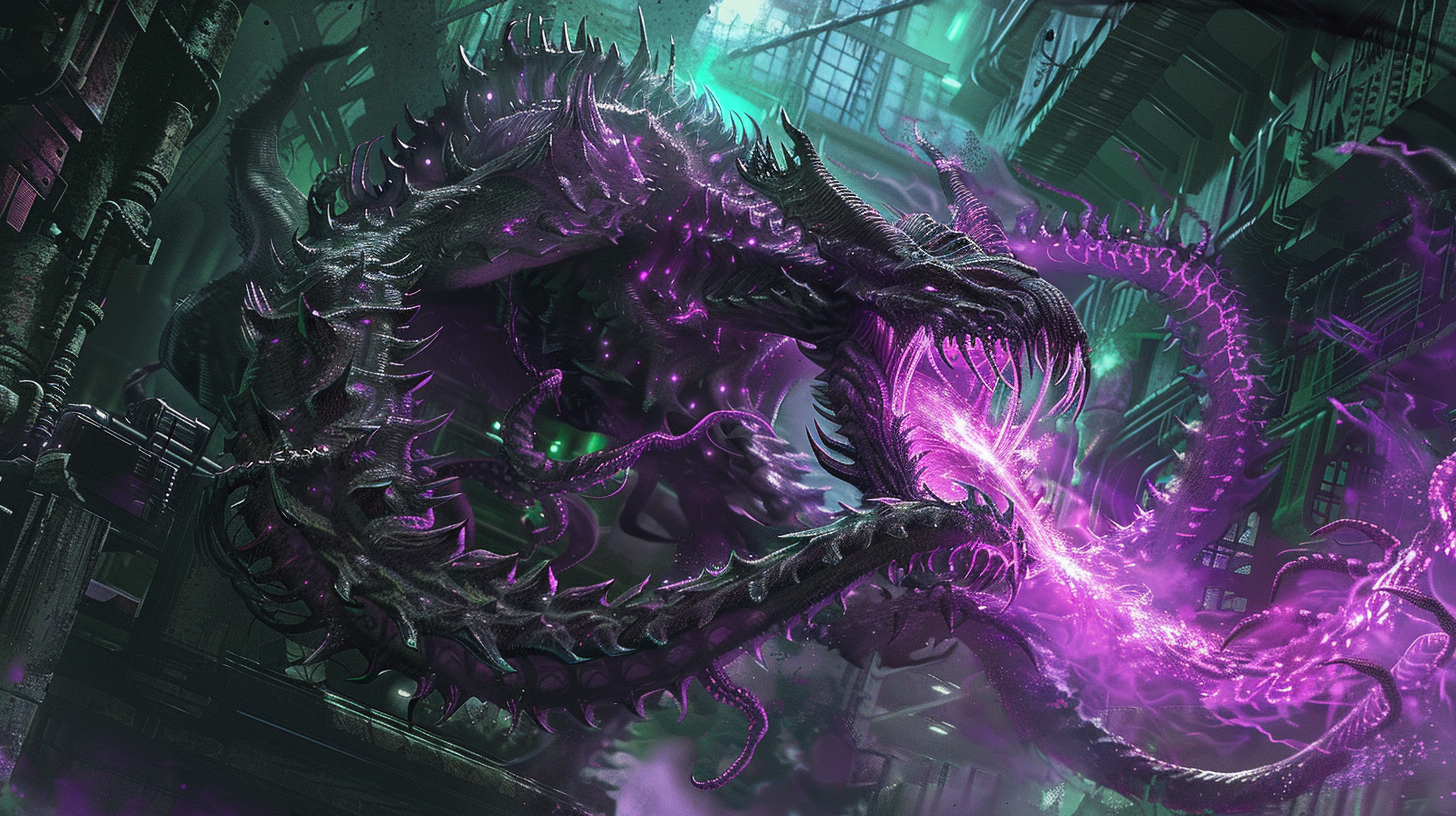 Red, Firen, Theo, Aubrey and their entourage of ghostly insurgents hurried through Nokkville’s empty streets, avoiding the gaze of the imps and undead on patrol. The group reached the edge of the Center City Square where the shadowy spire rose. The spire seemed to be made of a dark coloured stone with a slight opalescent sheen. The spire was constructed like a deformed bastion, complete with arrow slits. At the top, a torrent of magenta, evil essence poured upwards, forming the unholy barrier that protected the city.