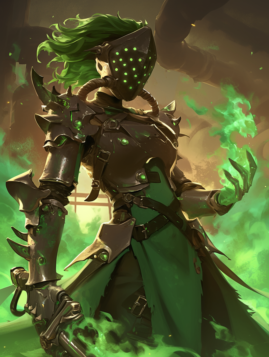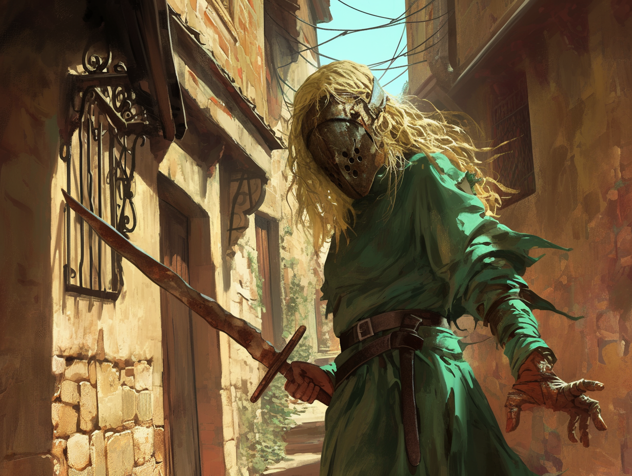 Venomeater’s reign of terror across Corgath seemed to begin overnight, with 3 families slaughtered in their homes. Witnesses came forward to report the atrocities, and everyone was quite surprised that this serial killer made little attempts to move silently and secretly. Everyone’s reports of the killer were the same: a woman bearing emerald green rags and a mask made of a sheet of rusting metal. In her hands, an old, bent sword1.