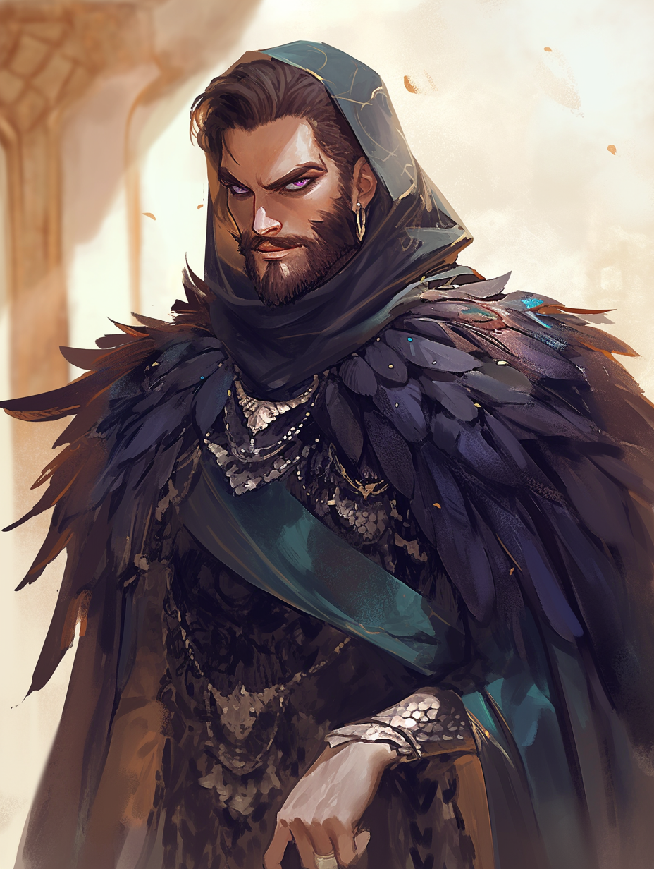 Al’Khasm appeared as a handsome, late 20s Jinifarian man. His signature wear was a cape of black feathers. He was often adorned with silver jewelry that assured others of his wealthiness (and therefore supposed reputability). Al’Khasm usually introduced himself as a seer, claiming that he had the gift of prophecy. By tapping into his supernatural power, Al’Khasm could easily cause his supposed prognostications to come to fruition, garnering the trust of whoever he was trying to convince.