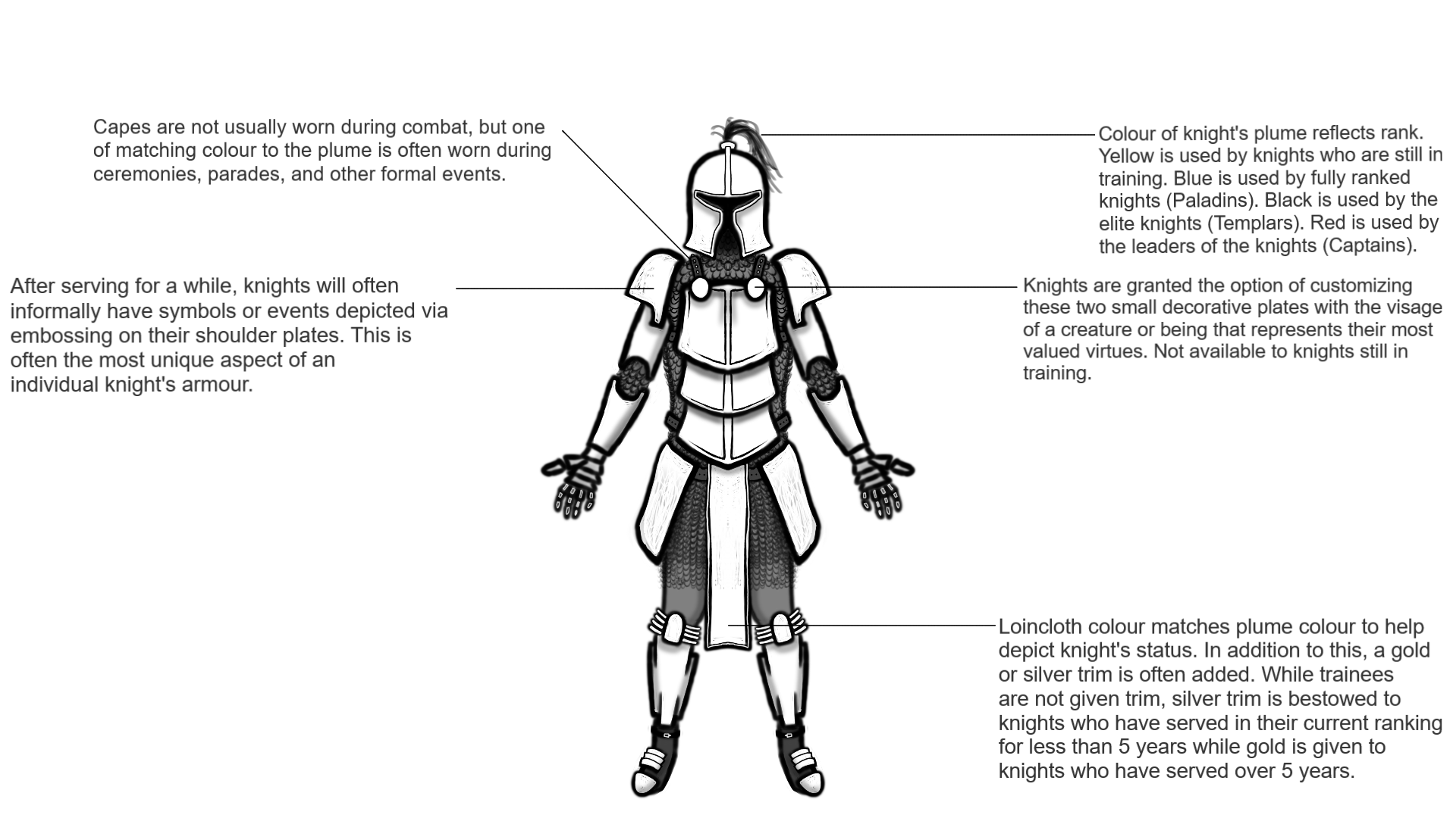 Paladins would often customize their armour to a great extent to reflect their personality and help identify themselves on the battlefield. Said customization typically manifested as decorative embossing or engravings made on the armour’s pauldrons and rondels.