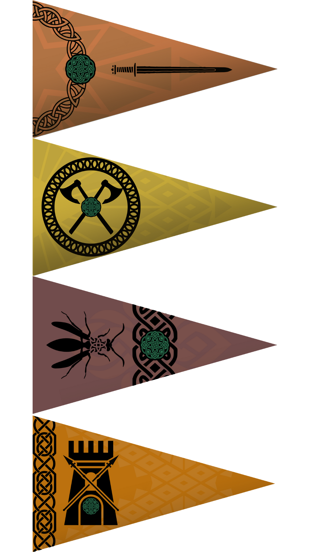 The four different flags representing the four different orders of serberkers. Each flag displayed the Dawn Knot in emerald green to represent how each of the orders were ultimately bound to the greater Cuprum Kingdom.