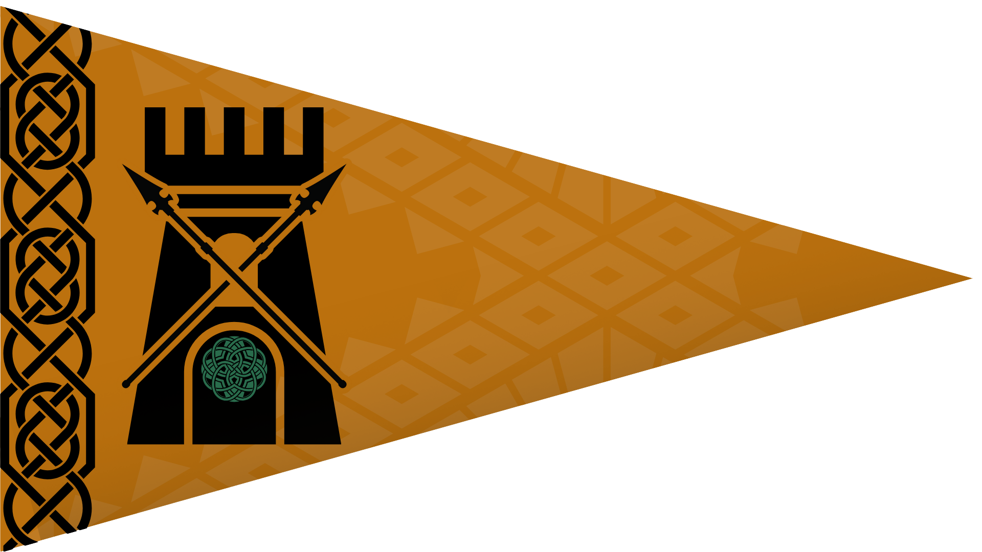 The flag of Castlearm, featuring crossed spears over a Cuprum fortress.