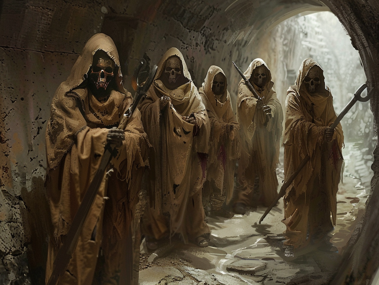 - The front half of a skull was worn overtop the face to hide facial features. When combined with their cloak’s hood, the figure of a Priest became alike all the others. This skull was usually harvested from a Manikin of a human or a dun. Sometimes these skulls were personalized through mutations induced by the somatomancer in the body of the manikin it was harvested from.