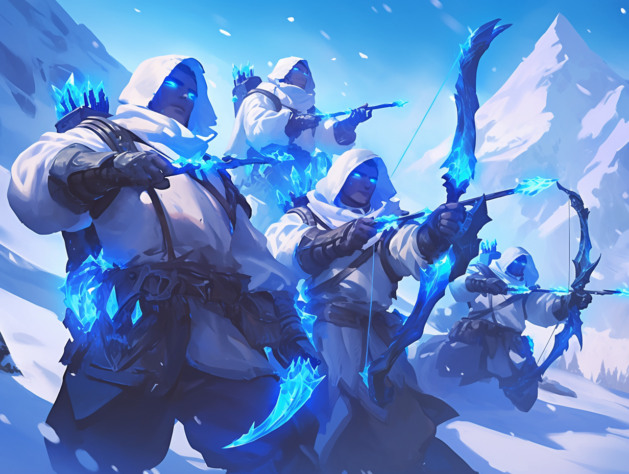White Archers use “Frostbite” Longbows, magical weapons that are infused with “Frostbite” Crystals. “Frostbite” Bows can flash-freeze the air, and with enough moisture, create arrows made of ice. This allows White Archers to conserve physical ammunition, although the ice arrows are weak against armoured targets. To note, some “Frostbite” Bows in the past have been so powerful, that they could freeze the nitrogen and oxygen in the air into arrows (of course, this meant users would have to use gloves and other protection to themselves)! Frostbite Crystals are illegal to be used in weapons outside of White Archers’ bows, but of course their potency has caused them to leak into the underground weapons market regardless of law.