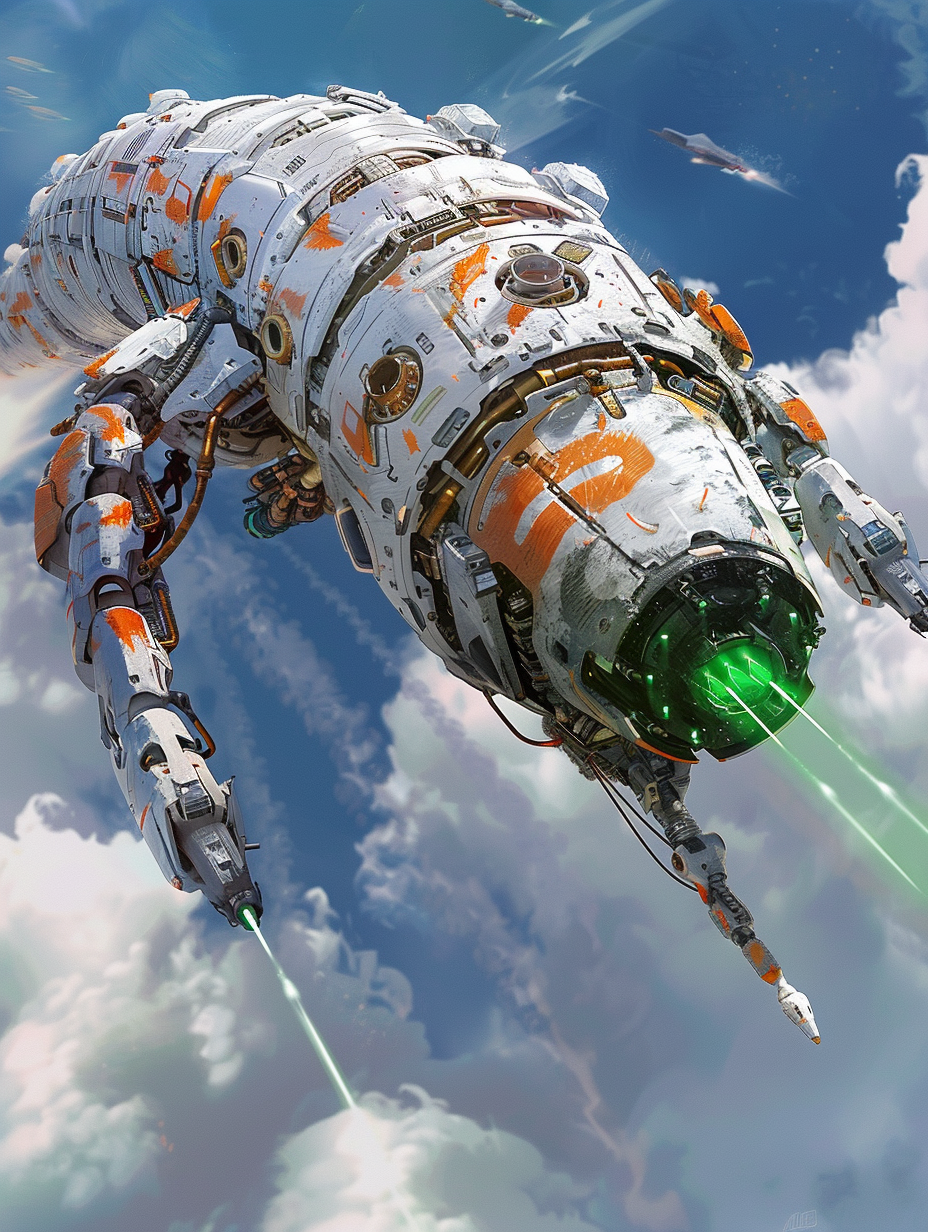 Tetrapede was a floating gun platform, with many different articulated turrets hidden among its “vertebrae”. From its front, it could also project a potent photon ray to melt through nearly anything. Short range SSM and SAM rockets were also stored inside its back for added artillery capabilities. With all of these weapons, Tetrapede was often sent to rain fire upon enemy forces, granting suppressing fire while Seraphim moved along the ground underneath it. Tetrapede could float up to 300 feet in the air before needing Angels to lift it higher. In theory, it could also function perfectly fine in orbit.