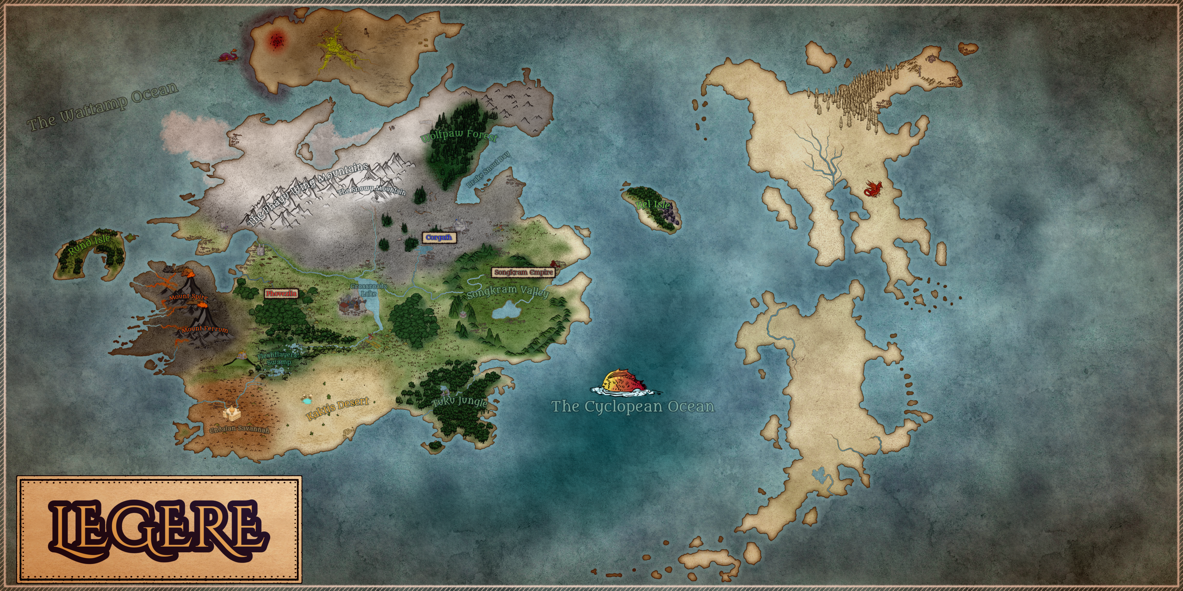 Much of Legere was covered in water. There were two main oceans that coated its surface. They were separated by Legere’s two continents, although they were linked through The Winding Strait.
