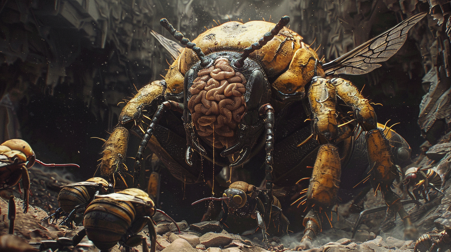 The queen was not a mobile being at all. With her enormous abdomen and exposed brain, she was in no shape to fight or even move. The queen was relegated to a life of motionless, commanding her maduka from the safety of the innermost sanctum of the hive’s stronghold.