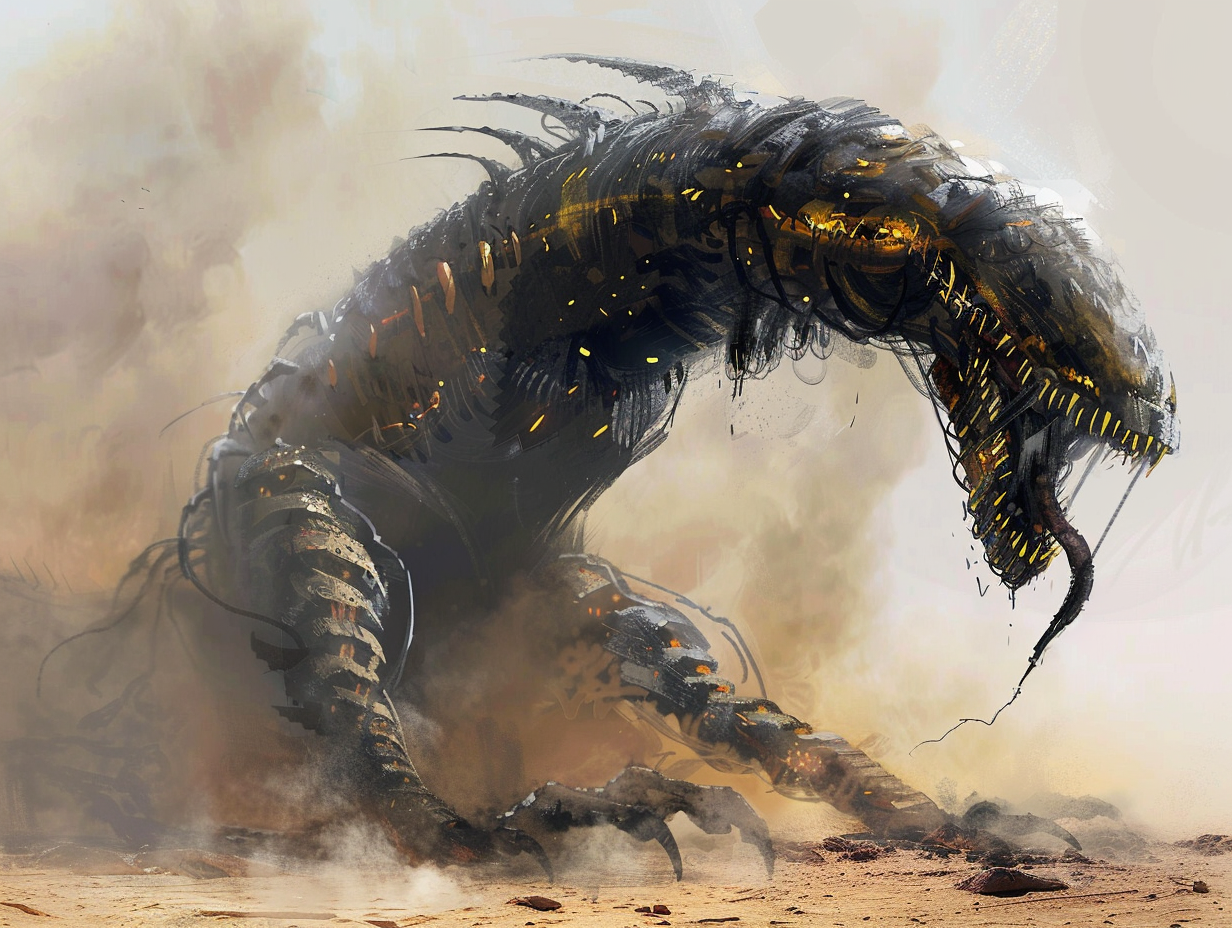 The moonbeast’s head resembled that of a reptile’s skull, with a myriad of pupiless yellow eyes. Its massive jaws had two rows of razor sharp teeth.