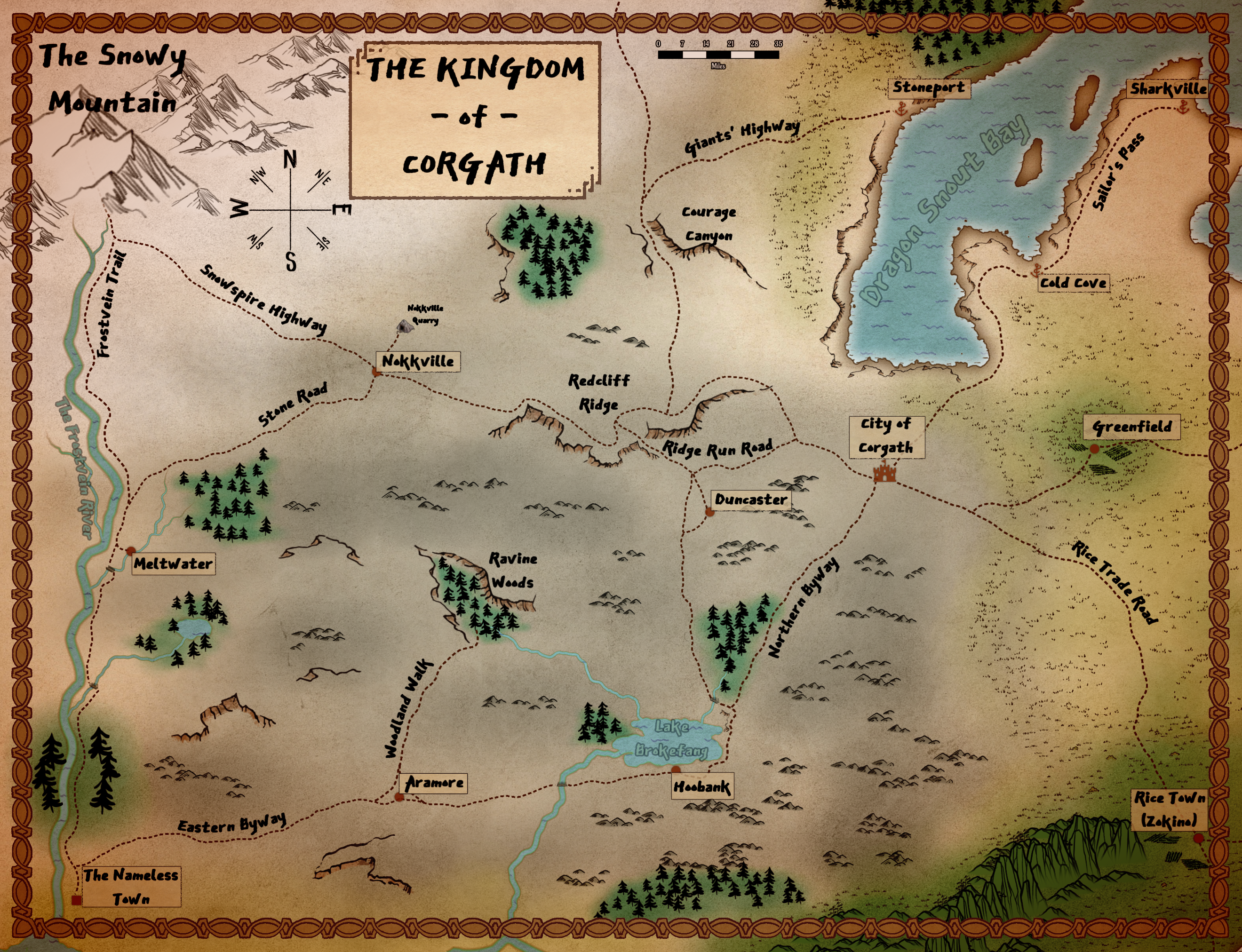 The kingdom of Corgath is a vast region with many cities, villages, and landmarks.