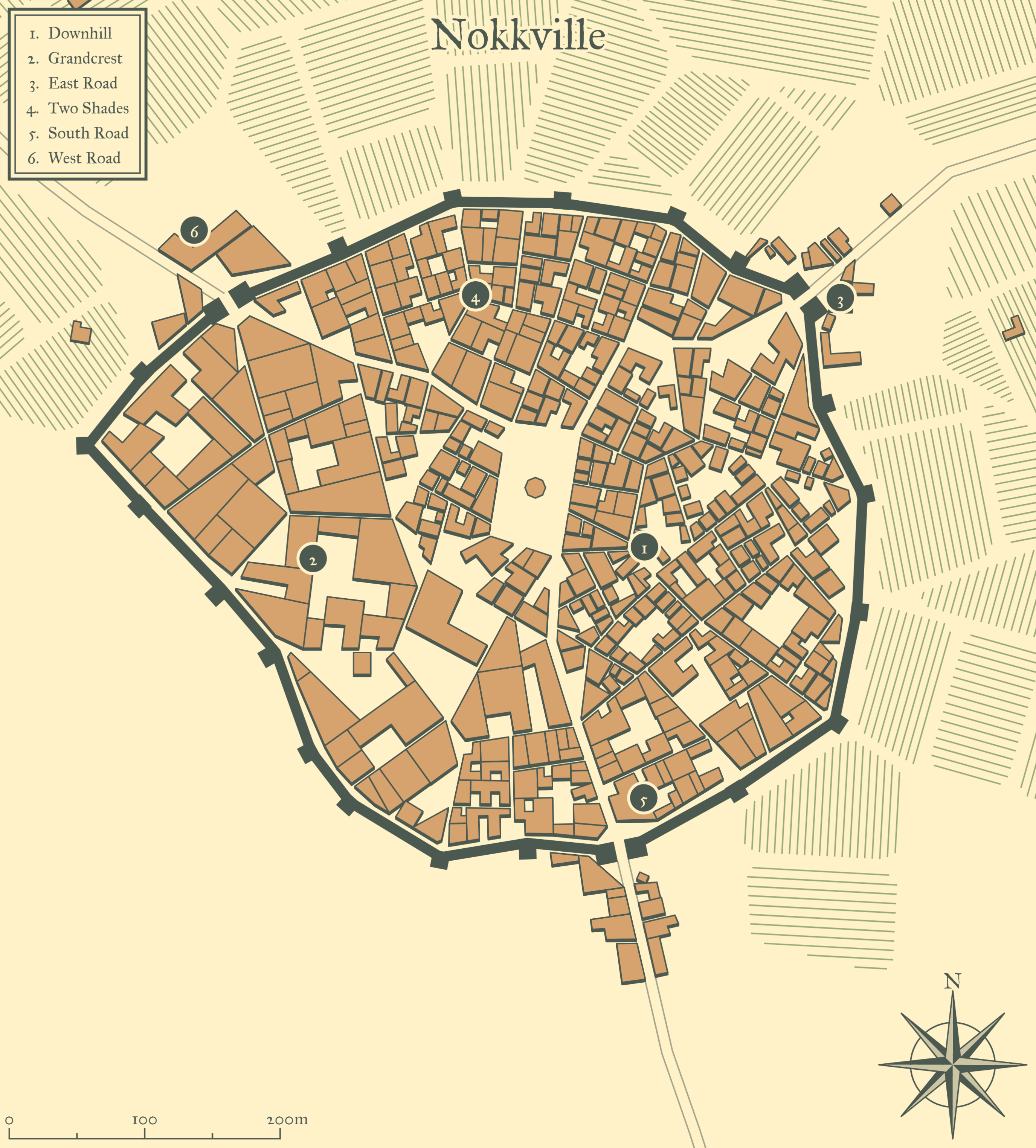 The town’s fanciest district was Grandcrest, which sat on a bit of a hill compared to the rest of the city and was made mostly of large homes of the upper middle class. Downhill was, true to its name, downhill of Grandcrest, where poorer families lived and some businesses operated out of those homes. Two Shades was the town’s business-focused district, where most merchants were found.